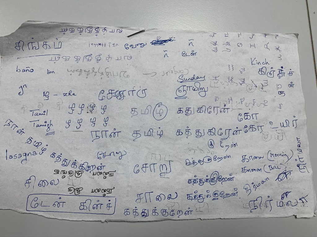 Sometimes Raghav will ask me a question in rapid Tamil, then (in response to the deer-in-the-headlights expression on my face) break it down word-by-word until i can both repeat the question back to him and answer it satisfactorily. Sometimes Gita will stand up to meet my gaze over the desk divider and ask if i know the name of a particular animal in Tamil.15 Sometimes i’ll hear a word pop up frequently in a particular conversation and ask them about it, or wonder aloud how to say a particular word or phrase in Tamil. And on every such occasion, the people around me have happily answered (and sometimes heatedly debated) my questions — we started out writing things down on a piece of scratch paper, but before long it became clear we’d have to move our tutorial notes to a dedicated notebook.